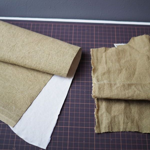 左:芯地を貼った状態 味わいのある生地の表情は残したまま、ハリが出ています。 右:素のプレーンな状態 キャップなどこの風合いの方が活きる場合は芯地を貼らないで仕上げる場合も。 |